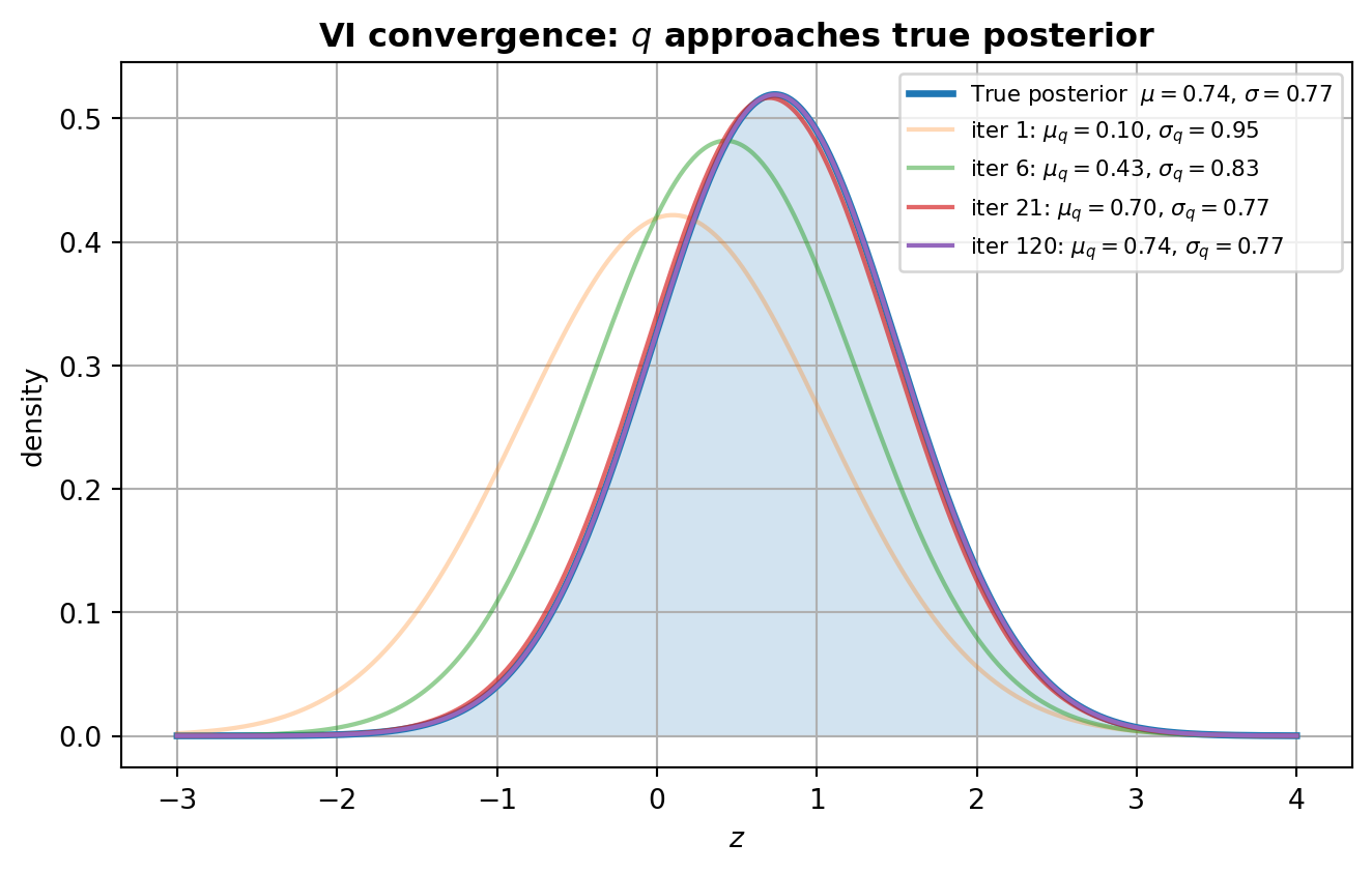 ax.set_title("VI convergence: $q$ approaches true posterior", fontweight="bold")