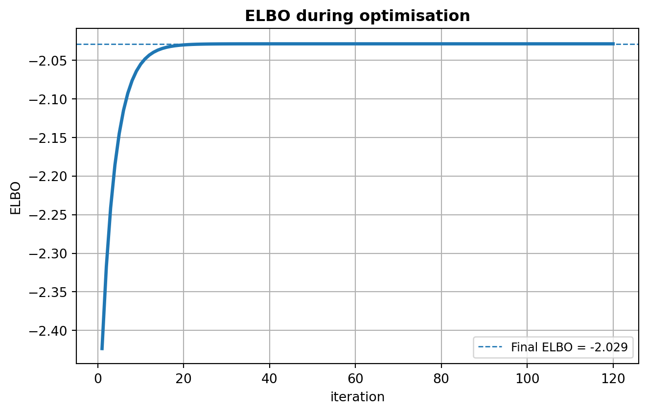 ax.set_title("ELBO during optimisation", fontweight="bold")